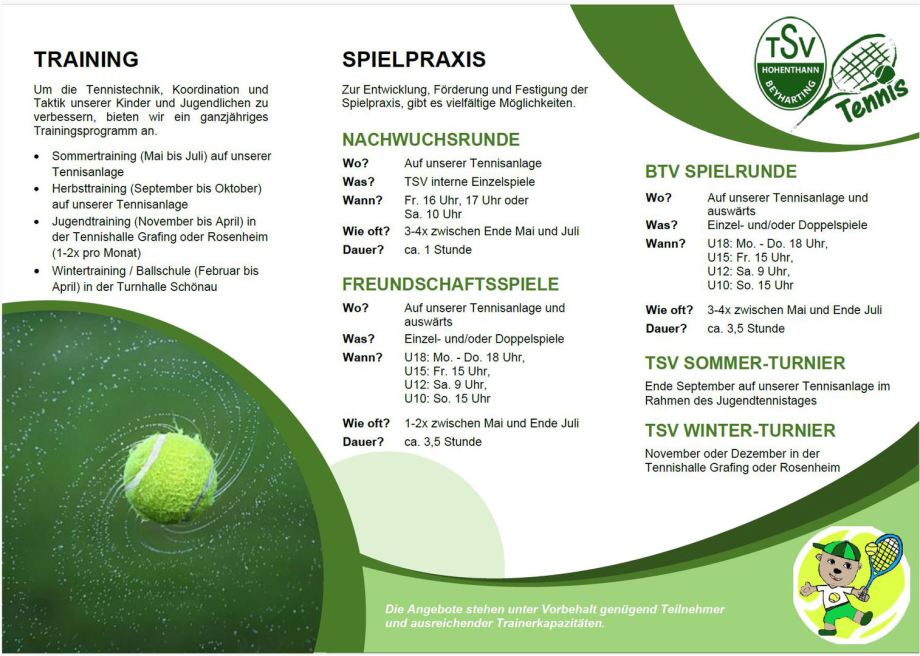 Tennis Nachwuchsrunde Jugend U8-U15 (Mitte Mai bis Ende Juli): Wir freuen uns, in diesem Jahr eine Tennis Nachwuchsrunde anbieten zu können. Teilnehmen können alle Kinder der Sparte Tennis, die gerne Wettkampfluft schnuppern wollen oder sich vorstellen könnten, in der Sommersaison 2026 am BTV-Mannschaftswettbewerb in den Altersklassen U10, U12 und U15 teilzunehmen. Genauere Informationen finden Sie im angefügten Flyer. Die Anmeldung ist ab sofort und bis spätestens 17. Mai 2025 unter folgendem Link möglich: https://form.jotform.com/250523486446056